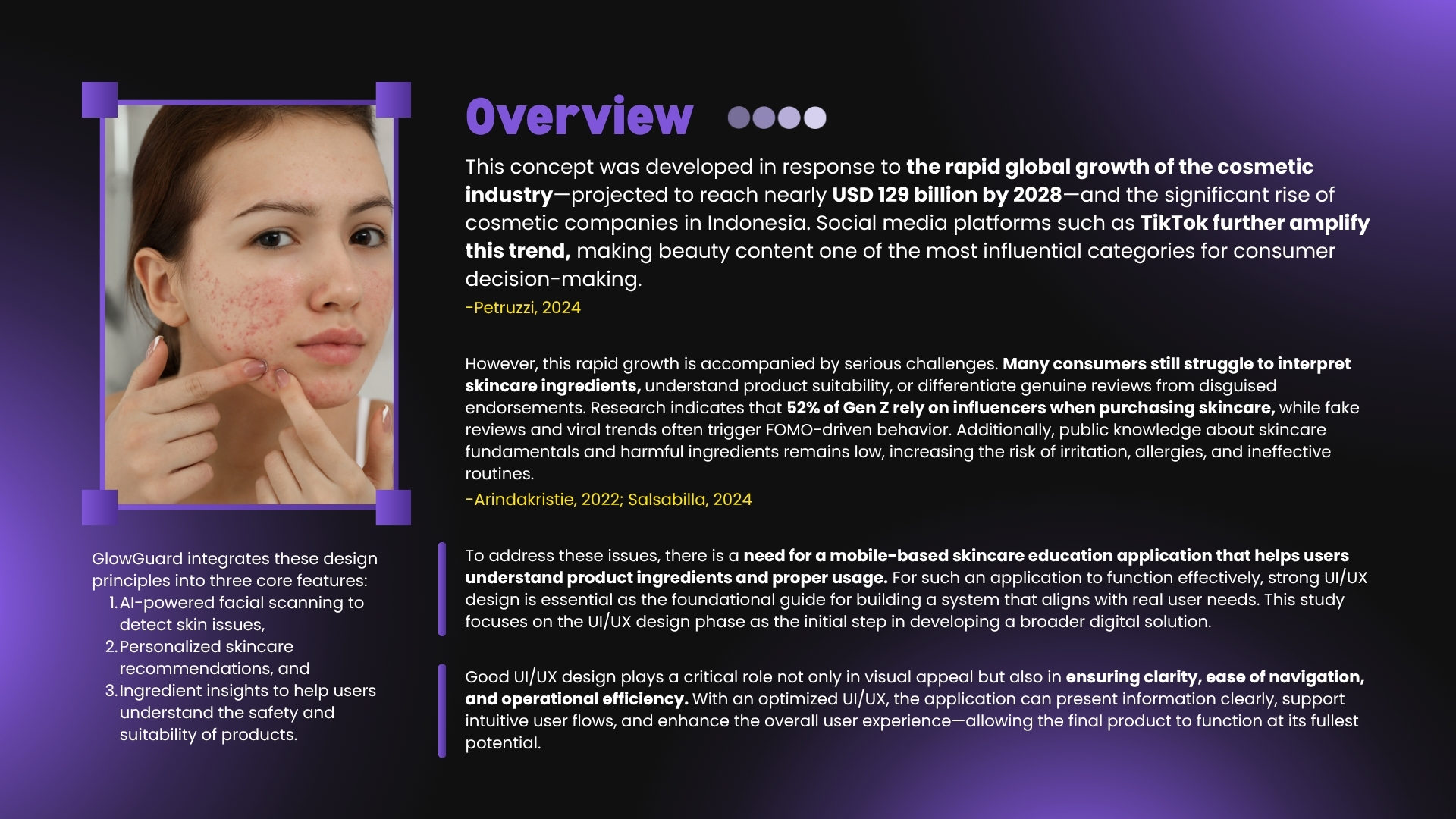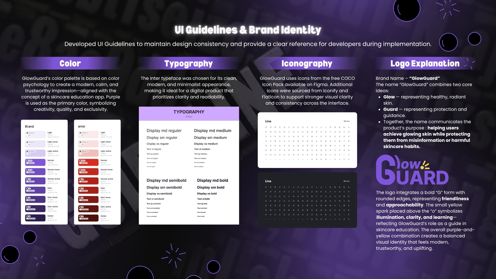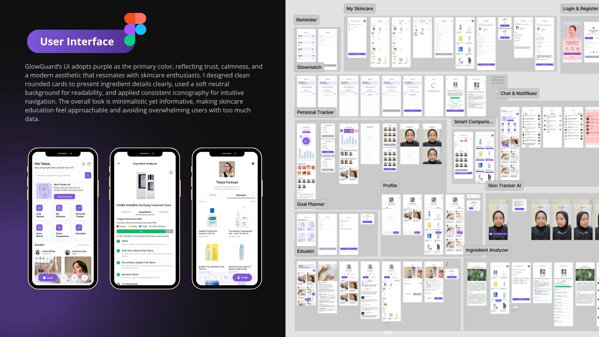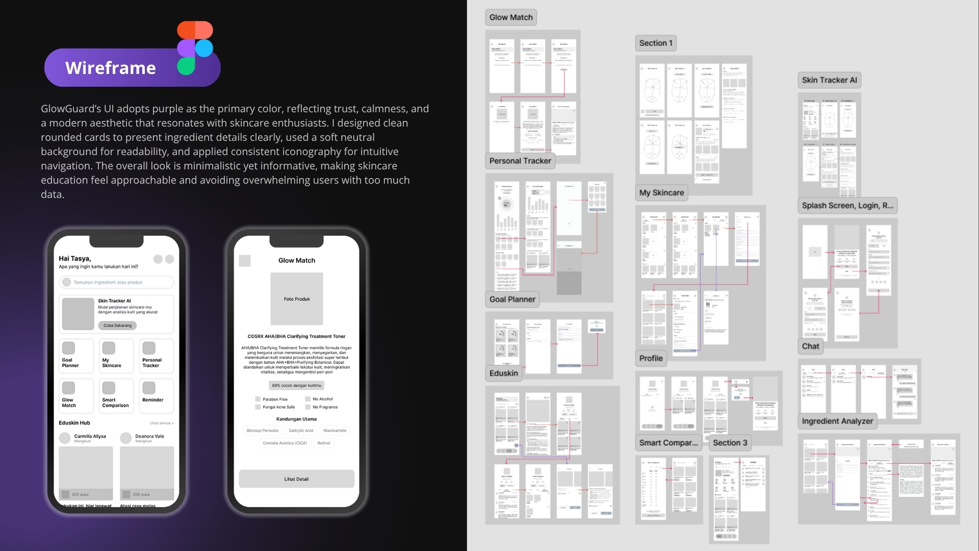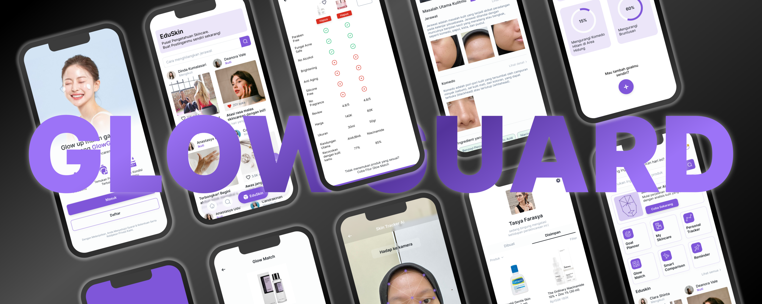 GlowGuard is a mobile app concept designed to educate users about skincare. It offers features like AI-powered skin tracking, personalized recommendations, ingredient analysis, and progress monitoring—all within a clean and intuitive interface.